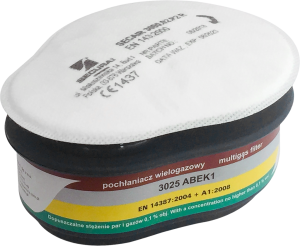- po skompletowaniu z półmaską lub maską, chroni układ oddechowy przed gazami i parami substancji organicznych i nieorganicznych, parami i gazami kwaśnymi, amoniakiem i jego pochodnymi organicznymi, a także mieszaninami w/w substancji